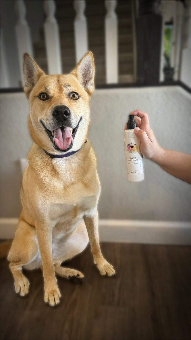 Pamper your pup with our luxurious Leave-In Conditioner! This magic spray softens, detangles, and adds a stunning shine to their coat. Use it on dry fur for luster and static control, or on wet fur to tackle tangles with ease—because your dog deserves the best!